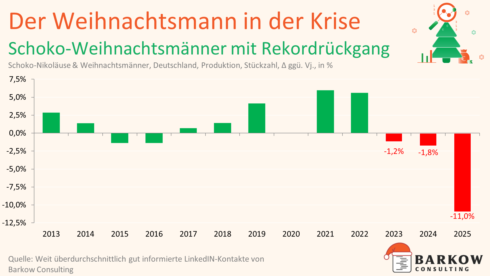 Die Produktion in Deutschland schwächelt – das ist ja bekannt und schlimm genug. Aber der Spaß hört wirklich auf, wenn auch Schokoladen-Weihnachtsmänner darunter leiden. Und genau das ist der Fall: Der stärkste Produktionsrückgang seit Beginn der Datenerhebung im Jahr 2012 mit satten minus 11 Prozent. Und auch bei Weihnachtsmännern schlägt die geringe Kauflaune der Deutschen durch: Die Inlandsnachfrage bricht um ein Viertel, also in Zahlen minus 25,5 % gegenüber dem Vorjahr auf läppische 82 Millionen Stück ein.