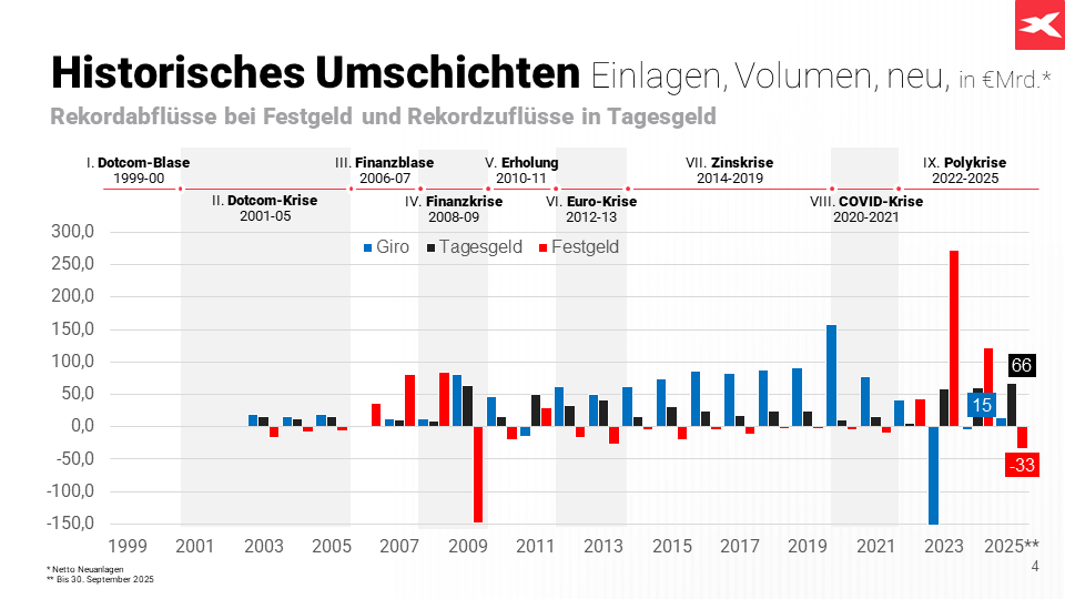 Nach zwei Jahren mit Rekordzuflüssen kehren Anleger dem Festgeld wieder den Rücken. Die Abflüsse summieren sich auf 33 Milliarden Euro und erreichen damit den höchsten Stand seit der Finanzkrise. Damals, im Jahr 2009, waren sogar rund 148 Milliarden Euro abgeflossen. Parallel dazu erlebt das Tagesgeld ein beeindruckendes Comeback: Anleger haben hier 66 Milliarden Euro neu eingezahlt: Ein absoluter Höchstwert. Der bisherige Rekord lag bei 64 Milliarden Euro und stammt ebenfalls aus dem Jahr 2009.