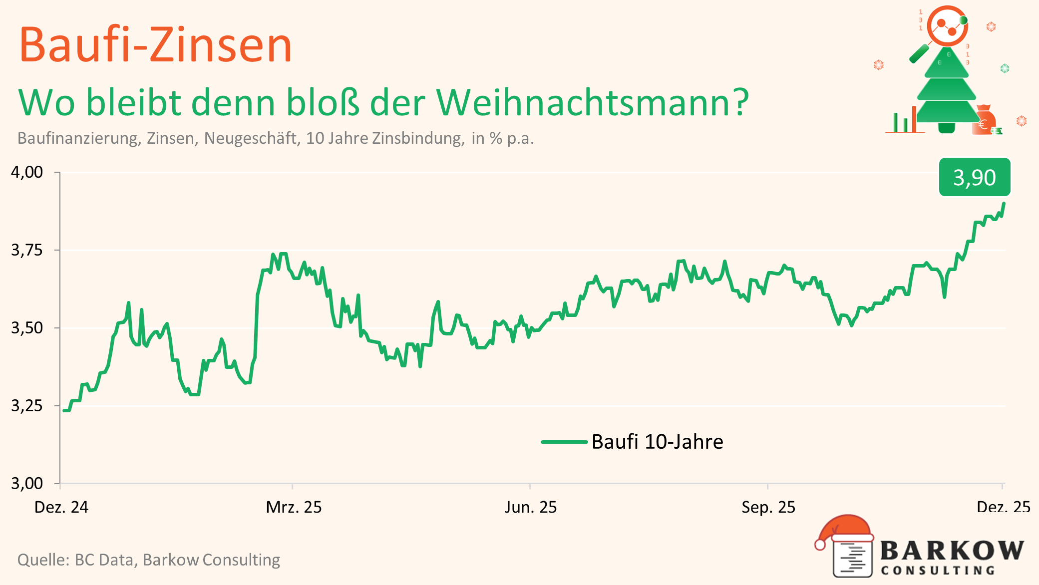 Auch die letzten Jahre waren ja nicht einfach mit all den Krisen, Kriegen und enttäuschten Wachstumshoffnungen. Aber zumindest auf den Weihnachtsmann war Verlass, denn er brachte sowohl 2023 als auch 2024 die niedrigsten Zinsen für Häuslebauer im Geschenkesack. Dies aber führt natürlich direkt zu der Frage, wo der Weihnachtsmann denn dieses Jahr wohl bleibt. Alternativ könnten Häuslebauer dieses Jahr allerdings besonders unartig gewesen sein…